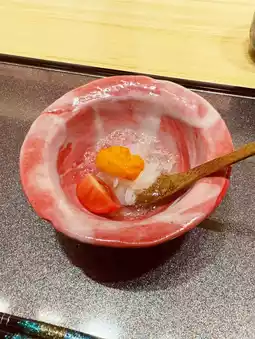 - 3 appetizers (steamed egg custard with crab meat, abalone with foie gras sauce, sweet and sour squid with uni)