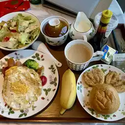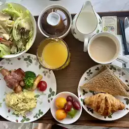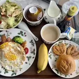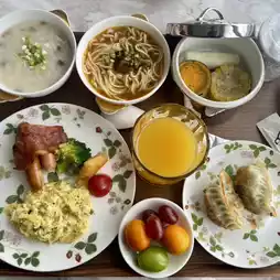 Breakfast is delivered to the room 🍳🥐, offering a fusion of Chinese and Western dishes ☕️🥓. The presentation is very upscale, greatly enhancing my appetite 🫕🍲. There’s a variety of egg preparations, sausages, bacon, salads, and bread 🥗—everything you could want 👍🏼. Special mention goes to the lean pork congee and fresh shrimp wontons, which were exceptionally delicious. "Rich" is the perfect word to describe it 🌈🌈.
