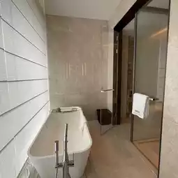 The room is 50m² with a 1.8-meter large bed 🛏️, offering ample space and great comfort 🖼️🖼️. The mattress and pillows have just the right firmness 🏖️, and the air conditioning is sufficient, completely relieving my fatigue ❄️. The bathroom features a dry and wet separation design 🛁 and even includes a standalone bathtub 🛀.