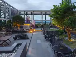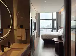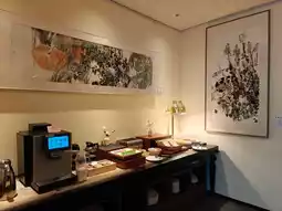 The first floor is indistinguishable from an office building, with guests treated the same as employees sporting access cards—swiping everywhere to get through, from the entrance to the elevator lobby. The reception is on the 40th floor, where three small islands on the right handle check-ins, eerily resembling a corporate front desk. A door nearby leads to a rooftop garden, conveniently catering to colleagues who enjoy puffing away. On the left, there’s a café open to the public called "Meng Guan," offering a cozy vibe. During quieter morning hours, it doubles as the breakfast spot for guests.