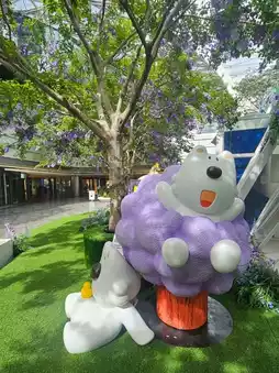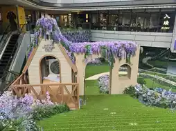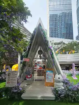 A pop-up store with a western-style church exterior, plus purple flowers and trees as the background, it is a great place to check in.