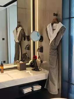 The room was upgraded to a high-floor executive king bed, with a splendid night view of the densely packed cityscape outside the window. The standard Yitel hardware includes electric curtains, electric toilet, Dyson hairdryer, and Peet’s capsule coffee, all fully equipped, along with various small upgrades like a makeup mirror, free minibar, and even alcohol. Additionally, the gym and self-service laundry on the 16th floor each have an extra set of equipment.