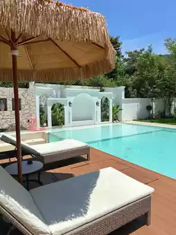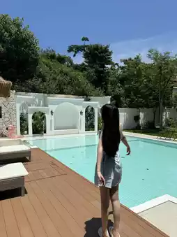 The entrance features an arched art corridor - super photogenic! Feels like a Southern French town! Outdoor amenities include a French-style swimming pool and hot spring bath ♨️