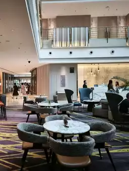 Due to waiting for a friend, I visited the Crowne Plaza Hotel near Shopping Park Station. Although the hotel lobby bar is not very spacious, the extremely high ceiling creates a comfortable atmosphere. The nearby tables were occupied by foreign guests. The staff provided attentive service, and the cakes and desserts in the display cabinet were visually appealing and reasonably priced. The specialty drinks were also quite good. Additionally, there is a giant teddy bear at the lobby staircase, making it a perfect spot for ladies to take photos.