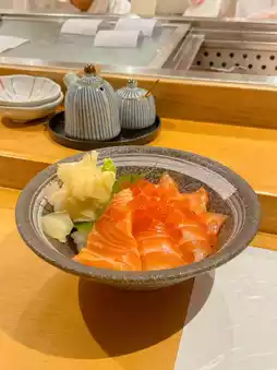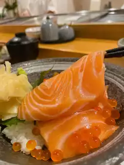 This dish features thick slices of fresh and tender salmon, salmon roe 🐟, pickled ginger 🫚, and a bowl of miso soup. Very satisfying 😌.