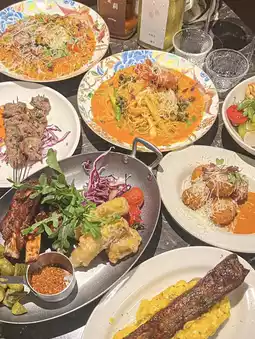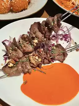 The restaurant is surrounded by warm yellow lights and charcoal grilled aroma