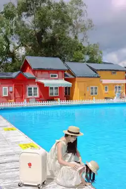 The resort is packed with kid-friendly features: slides 🛝, sandpits, photogenic colorful cabins 🏡, swimming pool 🏊, courtyard BBQ area 🍖, and in-room mahjong table 🀄️. Perfect for gathering mom friends – relax with drinks 🍻 and chats 💬 while the kids play. An ideal summer escape for moms' group trips!