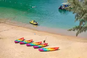🌊 In the crystal-clear glass-colored waters, kayaks resemble lively candies, slicing through shimmering waves, turning romance into rippling circles