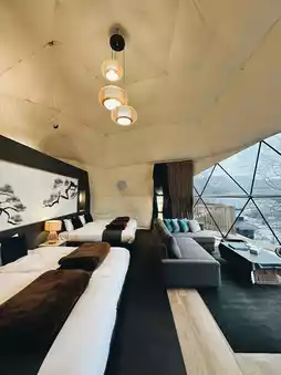 270-degree sea view king rooms facing the glass sea, some with private beach terrace hot tubs. Open the curtains in the morning to see the sparkling sea.