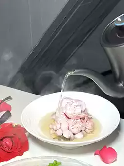 The presentation is exceptional, and the broth is sweet and savory. Made with hibiscus flowers from Zhangzhou, Fujian. Using scallops, maitake mushrooms, and hydrangea mushrooms to create a broth, add the hibiscus flowers. 🌷 Served when the hibiscus flowers are 50% ripe.