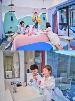 Over the past two years, the hotel has significantly upgraded its family-friendly amenities. For example, the whimsical Utopia Family Suite we stayed in wasn't just about changing the bedding and adding a small slide. The room actually had an octopus-shaped crib, which you could climb onto and slide down. The kids had a blast, excitedly asking to be "Dr. Skin," and they were absolutely delighted. From the walls to the bar, the theme is ocean-themed, and there's even a large slide on the outdoor terrace! 🛝 The immersive atmosphere even surpasses that of a theme park family room. Let's talk about the hotel's quirky utopia, which combines a family restaurant and a kids' club. It features a wide variety of high-end rides, staff members to entertain children, and a variety of hands-on activities every day. The restaurant's food 🍔 is prepared by the hotel's chef and is far superior to those found in shopping malls. If you get tired of playing indoors, you can head to the outdoor playground for some extra relaxation, where the ocean-inspired carousel 🎠 is particularly popular!