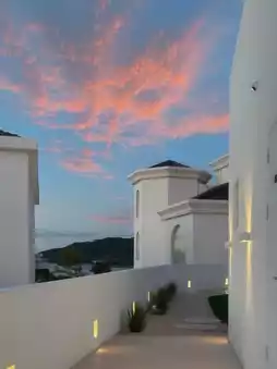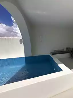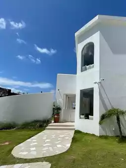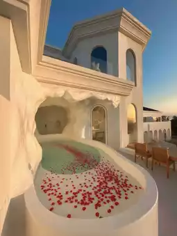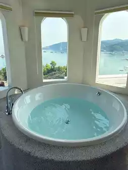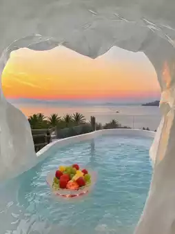 The salt-white standalone courtyard is super eye-catching, with cave-style design and an open-air bubble pool💦. The combination of blue walls and white tiles makes you feel like you've instantly teleported to the Aegean Sea in Santorini🏝️! Open the curtains to a stunning mountain and sea view, and in the evening you can enjoy a breathtaking sunset🌇—so beautiful it takes your breath away~
