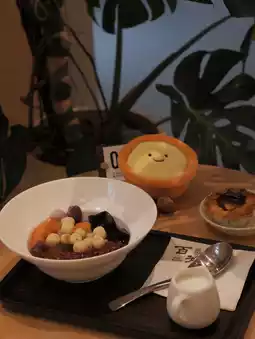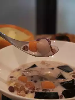 It comes with jelly, three-color taro balls, lotus seeds, red beans, and peach gum.