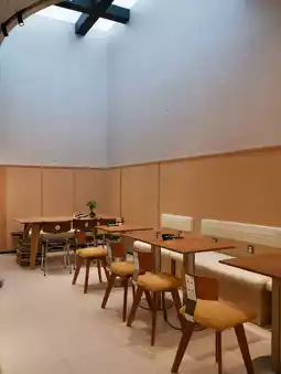 There's a bar and booths, creating a comfortable and bright atmosphere.