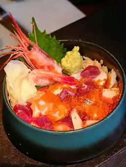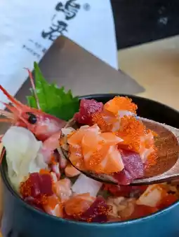 Full of sashimi covering the whole bowl of rice, with salmon, tuna, sweet shrimp and scallops, all very fresh! The sashimi is cut moderately thick and thin, and is fresh and sweet and bouncy. The best part is the vinegar rice at the bottom, which is slightly sour and appetizing, and goes well with the freshness of the sashimi.