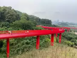 - The core is a 4 km bright red trail, like a floating red ribbon in the woods, the aerial view is amazing! Walking on it, you smell the fresh greenery, with viewing platforms, large lawns, and glimpses of a golf course along the way, offering a very open view.