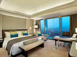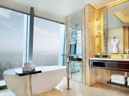 The guest rooms are elegantly designed with a warm color palette, complemented by bespoke furniture, artistic wall decor, and exquisite soft furnishings. Most rooms feature floor-to-ceiling windows, offering stunning views of Shenzhen's skyline and Hong Kong's mountain ranges, allowing guests to experience both urban vibrancy and tranquility from above. Public areas such as the library, lounge, and restaurants continue the theme of refined elegance, combining artistic flair with practicality.