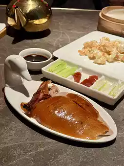 Golden Duck Season's signature dish is Peking duck, roasted using authentic fruit wood, resulting in a unique wood-roasted aroma, crispy skin, and tender meat. The duck is sliced right in front of the customer to ensure the meat remains fresh and hot.