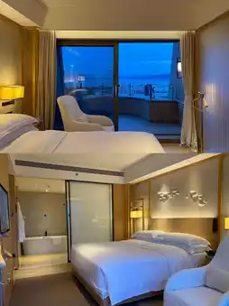 👍🏻 Overall, the hotel has a good location, about a 35-minute drive from Bao'an Airport. The 270-degree circular sea view corridor on the seaside tightly connects the hotel, Sea World Culture and Arts Center, and Prince Bay Coastal Park. The commercial facilities are supported by Sea World and K11 Ecoast, making it very suitable for both business travelers from other cities and local Shenzhen guests to come here for weekend leisure and vacation.