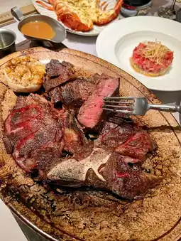 [Butter-Aged Australian Wagyu M5 Red House T-Bone] The Australian Wagyu M5 beef is incredibly tender and richly flavored. Every bite is a delight, no seasoning needed. [Signature Slow-Roasted Whole Cut Australian Grain-Fed Sirloin M5] This slow-roasted whole cut of sirloin steak is cooked to perfection, preserving the beef's original flavor and savory aroma. It's tender, juicy, and incredibly delicious.