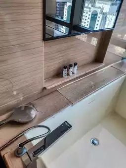 The hotel enjoys a prime location, just 5 minutes from Exit D of Gangxia Subway Station. Nestled in the heart of Shenzhen's Futian CBD, it's surrounded by vibrant and bustling surroundings, offering a vibrant urban experience. The room was well-designed and furnished, creating a pleasant surprise for the birthday person. The bathroom had separate wet and dry areas, and the space was spacious, bright, and warm. Initially, we deducted some points due to a slight odor of cigarette smoke in the assigned room and floor, as well as cracks in the bathtub tile.