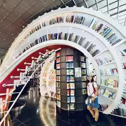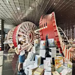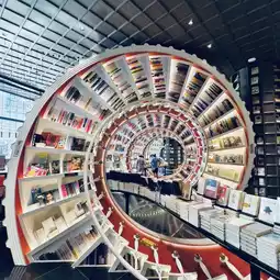 The red spiral bookshelves stretch high, paired with mirrored ceilings,