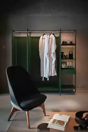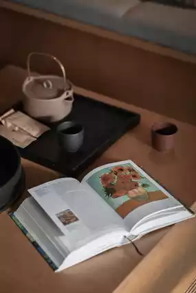 Strolling up the black metal stairs, the exposed concrete walls carry the romance of "ruin aesthetics." The concrete beams coexist with the wooden coffee table and ceramic tea set. Nestled in the booth reading a book, the industrial coldness also holds a warm homely feeling.