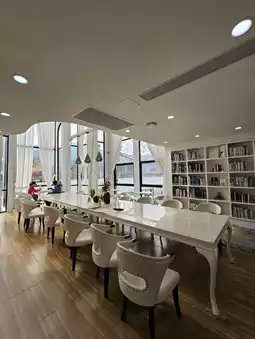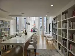 Tucked away in the outlet mall, the library resembles a white church from the outside, making it quite beautiful. Normally, it's not crowded, allowing for free entry and exit. The white European-style interior seems to float on an island in the middle of a lake, with swans floating on the water, creating a tranquil and relaxing atmosphere. The large floor-to-ceiling windows, accented by white gauze curtains, and the extensive library collection make it a perfect place for quiet study or reading, a truly refreshing experience.