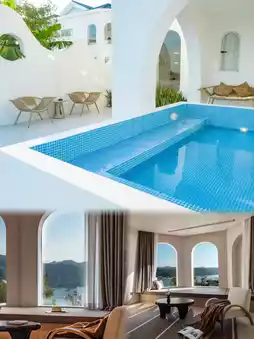 The guesthouse features a Greek Santorini style, built on a cliff by the sea, adjacent to Sapphire Beach. The architectural layout consists of three buildings: L, J, and K, with an overall blue and white color scheme. There are sea view hot spring rooms, cave-style hot spring rooms, and a total of 25 rooms, each with a unique view.