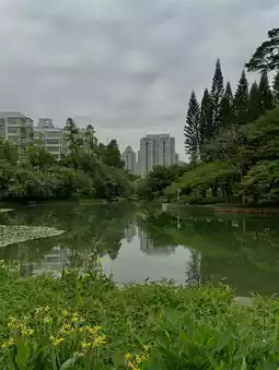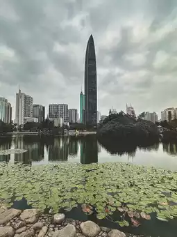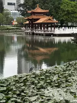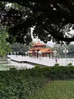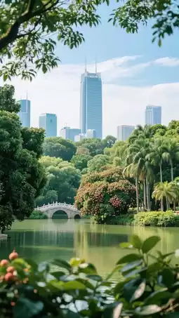 The centerpiece of the park is a large tranquil lake. The park features lychee trees, expansive lawns, pavilions, bridges, dancing people, and musicians. Nearby, you can find the Diwang skyscraper and a massive book complex.