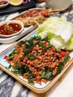 Classic Thai flavor, chicken minced fried very seasoned, with a slight spiciness ~ scooped with shrimp chips, crispy and delicious!