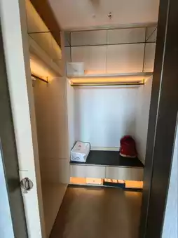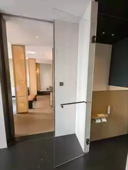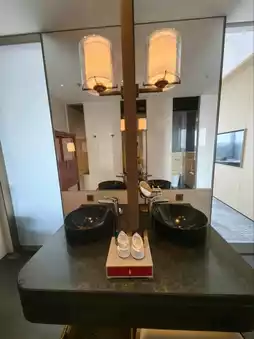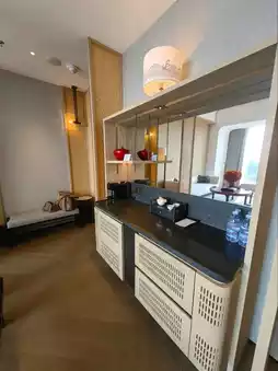 Upgrading to a suite, I simply asked during check-in if there was a sea view, and immediately received a second upgrade. The overall design is centered around the concept of "Chinese aesthetics in everyday life." Bamboo, wood, and lacquered woodwork cleverly blend local culture with modern luxury, creating a unique oriental aesthetic. Inspired by the "tide culture" of leaping fish, HUALUXE Bao'an incorporates the dynamics of waves into architectural lines and decorative details. For example, the lobby's art scroll depicting a dancing fish creates a majestic atmosphere. The furniture features predominantly square lines, creating a perfect separation between the living and bedroom areas. The bathroom features multiple mirrors, a three-part structure, double sinks, and an oversized bathtub. There are both a master and guest bathroom.