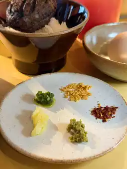 The set has three pieces of burger steak: the first original to feel the juice burst; the second with carrot puree and grapefruit vinegar, refreshing and refreshing; the third with raw eggs mixed with soy sauce, tender and flavorful. This gradual method of enjoyment truly realizes the enjoyment of the taste buds.