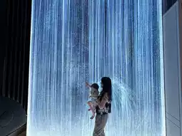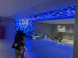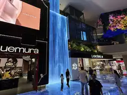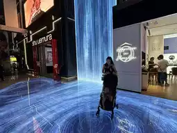 Neon flowing lines and mirrored reflections of colors make the entire mall feel like a futuristic world.