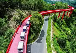 This 8-meter-high red skywalk weaves through the forest. When sunlight filters through the leaves, the whole scene looks like a dreamy movie shot! It’s recommended to wear light-colored clothes for photos, which contrast beautifully with the red skywalk✨