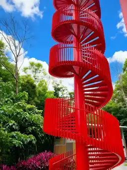- Top floor of the panoramic tower for an overhead view of the red boardwalk winding like a ribbon!