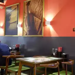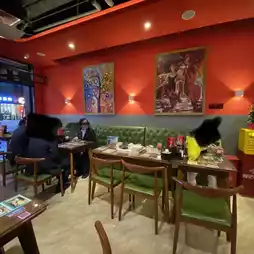 🏠Environment: The theme is red and black, with floor-to-ceiling glass doors. The interior decoration is relatively simple, with oil paintings on the walls, wooden tables and green chairs, plenty of seats, and the tableware, paper towels, etc. are fully equipped.