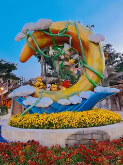 Thumbelina Jungle: The spiral jungle design allows you to enjoy the whole view of the park. It is mainly equipped with non-powered facilities, such as the Ugly Duckling trampoline, a large tree house with a huge climbing slide, a fairy tale corridor, a maze, etc. There is also a "Thumbelina" talk show here.