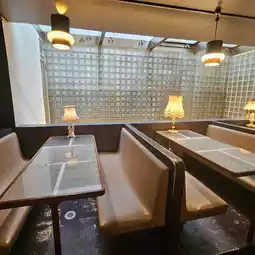 The back of the underground seating area has a wall with a foreign landscape, making it stylish.