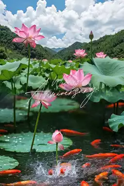 3⃣ Lotus Fragrance Pavilion: Wooden pavilion in the center of the lotus pond, ancient-style architecture harmonizing with lotus flowers;