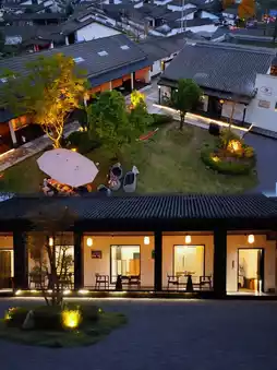 🌙 The courtyard at night is bathed in soft light, making everything seem so dreamy.