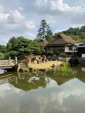 The garden of a feudal lord from the Edo period that remains within Hikone Castle is a pond-style strolling garden that is a luxurious example of Edo culture. The castle tower viewed across the pond is picturesque.