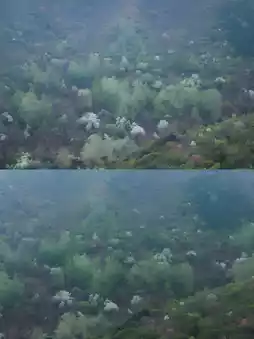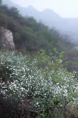 3, Many white and green flowers bloom on the mountain, possibly identified as white crabapple flowers, Chinese photinia, and large-flowered saxifrage, which look good from afar and up close. That day was a bit foggy, giving a sense of an oil painting from a distance.