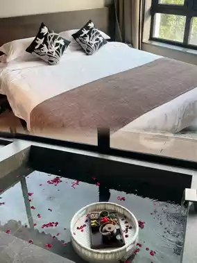 I booked a private hot spring room with its own independent hot spring pool! The hot spring water is directly piped in, crystal clear, and leaves your skin feeling incredibly smooth after a soak. The room also has a high-definition TV, an intelligent voice assistant, and incredibly soft bedding. Lying on the bed feels like being enveloped by clouds.