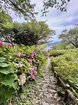 I particularly enjoy standing at the park's higher vantage points, where a vibrant sea of flowers stretches below, and the expansive blue of Shimoda Bay and the Pacific Ocean unfolds in the distance. The panoramic view is so captivating that it makes you lose track of time. The park also hosts a Hydrangea Festival, featuring flower viewing during the day and enchanting illuminations at night, adding to the romantic ambiance.