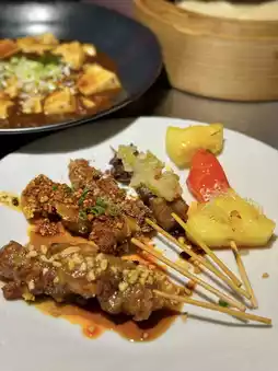 Beef tongue skewers, lamb skewers, pork cheek skewers, sate ayam, and grilled pineapple platter.