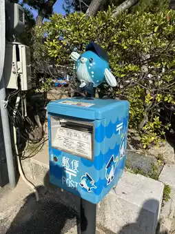 Below, there is a blue pufferfish postbox, the only one of its kind in the country 🐡📮💙