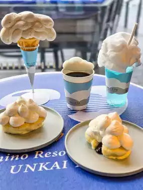 Starting May 1st, the Unkai Cafe within the terrace began selling Cloud Cakes. These adorable sweets are made with cream using Tomamu milk, designed to resemble clouds. When you cut into the cake, you'll find a sauce made with haskap berries inside.