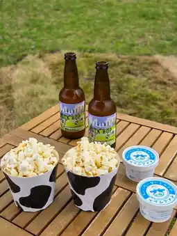 The main attraction is "MILK HOP," an IPA (India Pale Ale) beer made with Tomamu milk produced at Farm Hoshino. To accompany your beer, they offer "HOP CORN" and ice cream made with Tomamu dairy products.