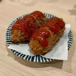 The sourness of the ketchup is exquisitely intertwined with the creamy croquette inside. The creamy flavor of the crab overflows from the crispy batter.